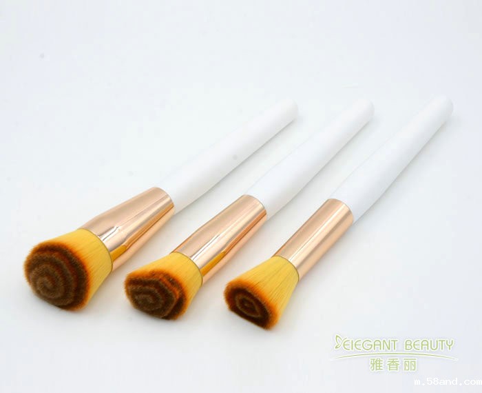 轮廓刷:和腮红刷差不多体积但是平头,用来打脸部的阴影使轮廓线条更清晰。 毛短而圆的刷,用来刷深色腮红,刷在颧骨下使颧骨高耸出来,这只是选择性的,想要化妆看上去成熟一些就要使用此刷,想要看上去可爱自然,就不需要此刷。 斜面的刷头特别适合面部立体效果的营造,使用时多从太阳穴处斜刷向颧骨处。